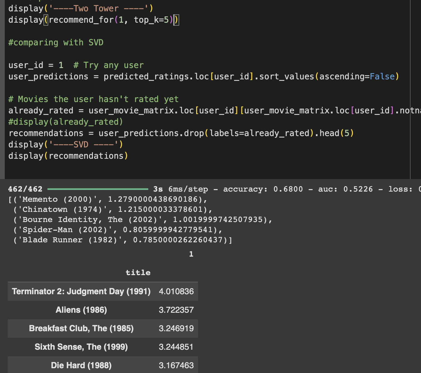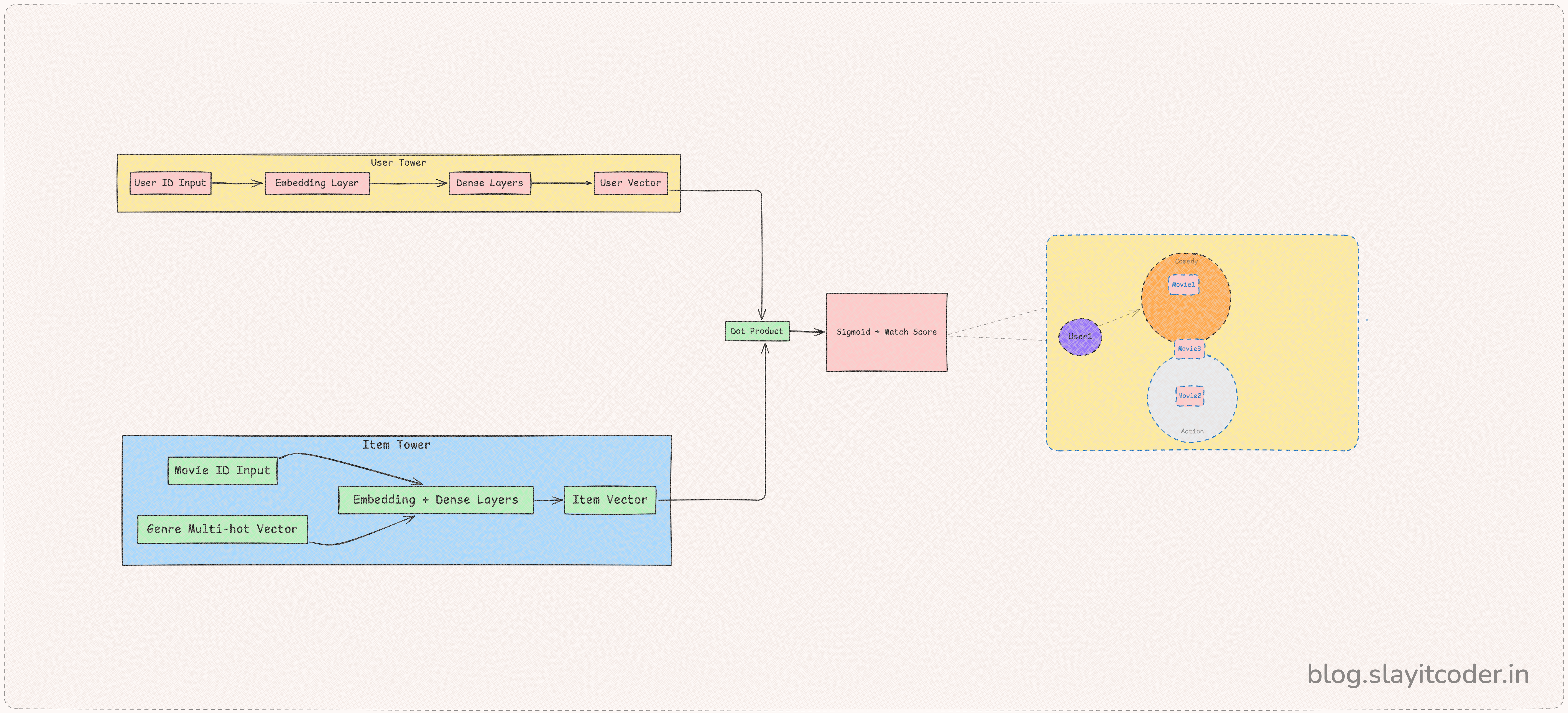 SVD gave us “people who watched X also liked Y.” Two-Tower gives us “you like Action + Comedy? Here’s something right up your alley.”