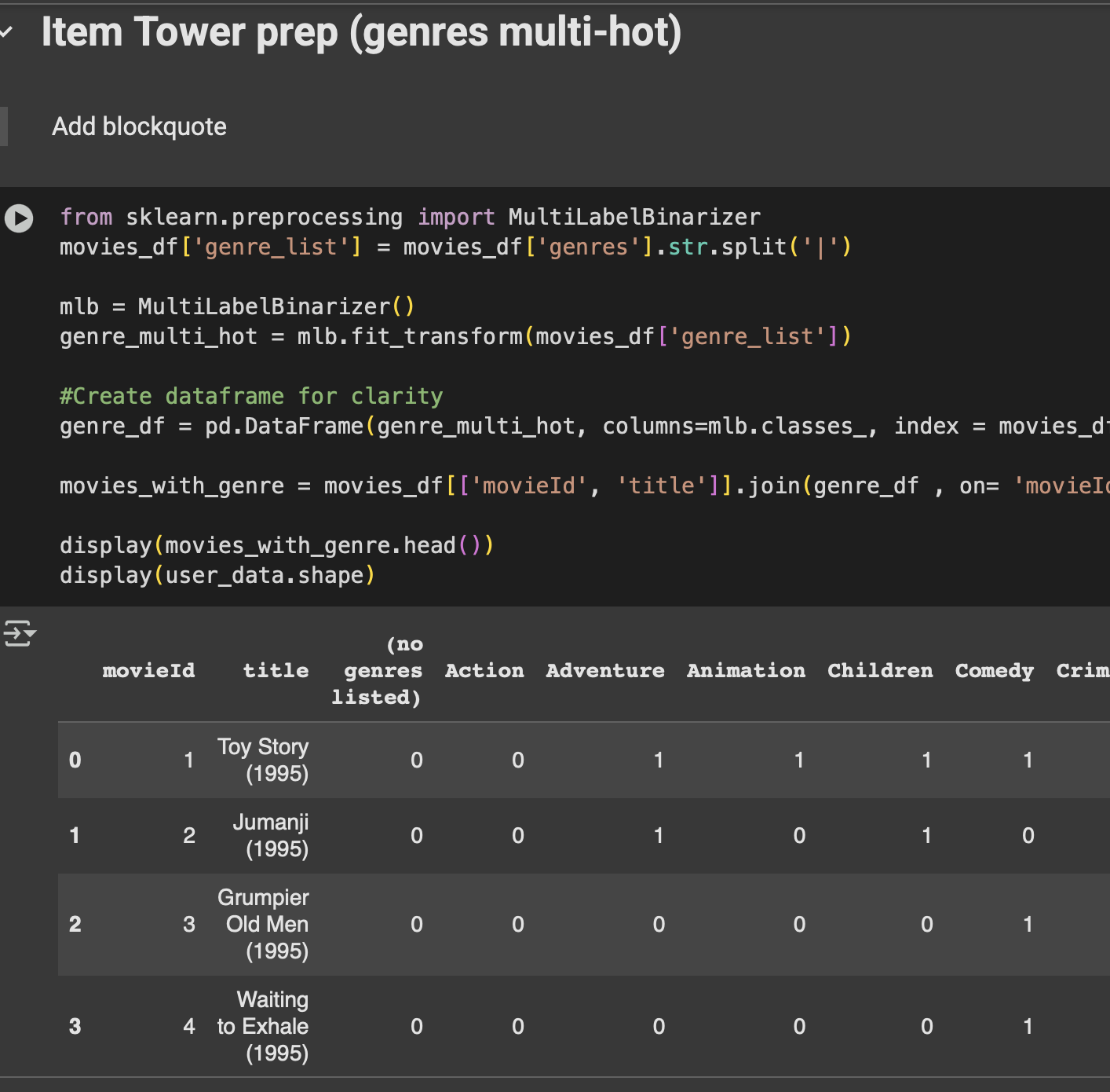Fig: Code snippet- MultiLabelBinarizer + Genre Prep