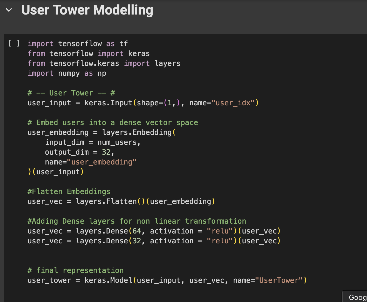 Fig: Code snippet- User Tower model